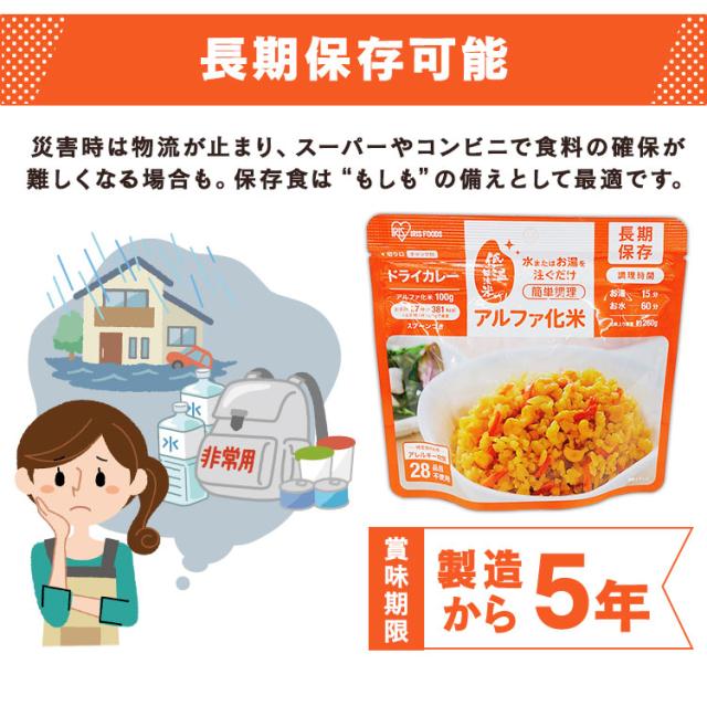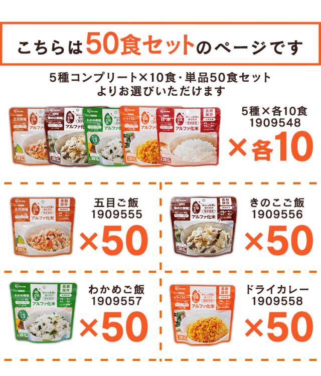 非常食 非常食セット アルファ米 5年保存【50食】保存食 非常食セット 非常食 ごはん アルファ化米 五目ご飯 きのこご飯 わかめご飯 ドライカレー 100g 防災食 備蓄食 防災用品 災害 備蓄 非常用 地震 お米 ご飯 長期保存 災害食 α米 アイリスフーズ