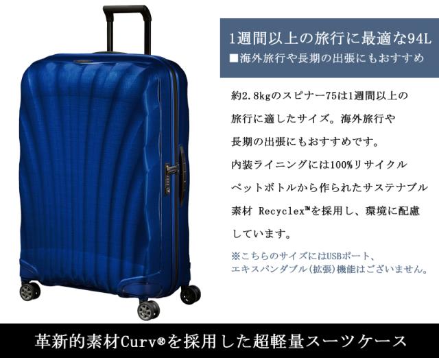 約2.8kgのスピナー75は1週間以上の旅行に適したサイズ。海外旅行や長期の出張にもおすすめです。