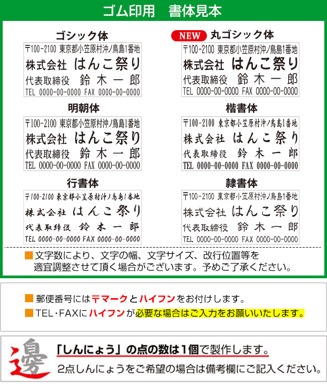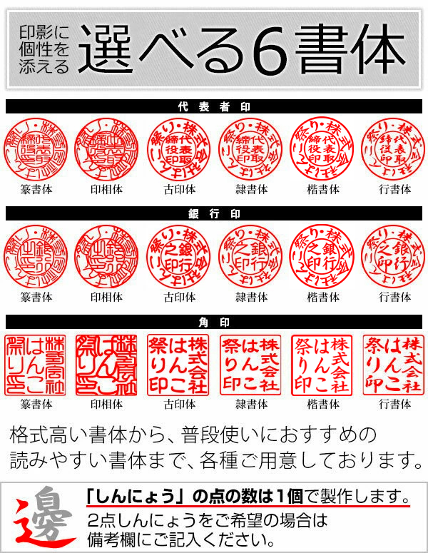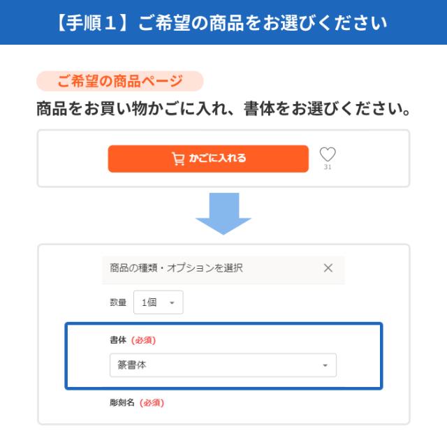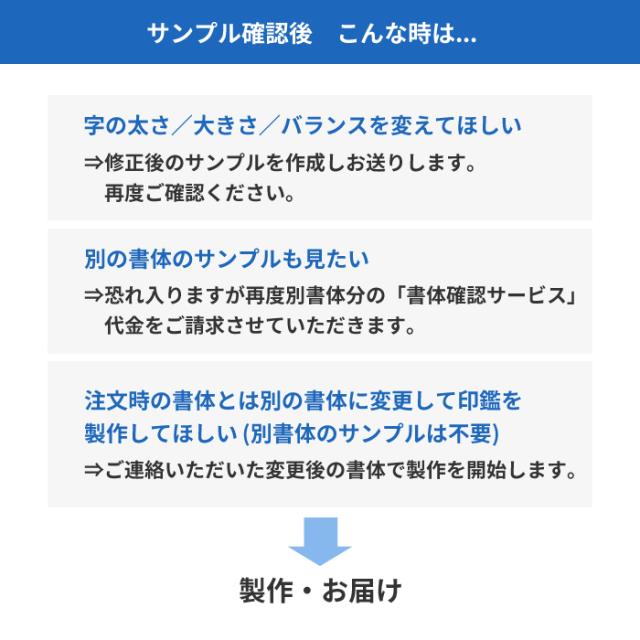 | ■「書体確認サービス」のみでのご注文は承っておりません。 ■「書体確認サービス」をご利用の場合、デザインをお客様に確認いただいた後、製作となりますので通常のご注文よりもお時間をいただいております。 そのため、「即日配送」及び「書体確認前の配達日指定」はご利用できませんので、お急ぎのお客様はご注意ください。 ※「即日配送」商品を同時にご購入の場合は「即日配送」の対象外となります。 ■サンプルは、画像データをEメールで送信する形での納品となります。 gif若しくはjpgの画像ファイルがご覧いただける環境でのご注文をお願いします。 ■「書体確認サービス」のご利用料金は、ご購入の印鑑との商品代金総額でのお支払いとなります。ご注文の印鑑納品書に「書体確認サービス」を記載いたします。 ■「書体確認サービス」は適用商品と非適用商品がございます。お手数ですがご注文の際にお問い合わせください。 ■「書体確認サービス」は文字の形状をご確認いただくサービスですので、細かいご注文に対応出来ない場合がございます。予めご了承ください。 また、彫刻の関係上、文字の太さなど仕上がりイメージに若干の差異が生じる場合がございますので併せてご了承願います。 ■「書体確認サービス」は、性質上「ご注文のキャンセル」「返品」等は出来ません。ご了承ください。 |