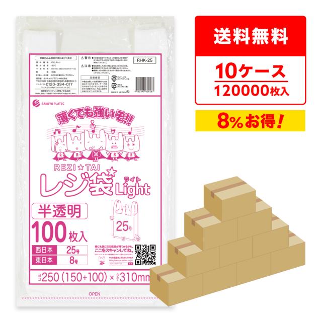レジ袋 買い物袋 薄手 西日本 25号 (東日本8号) ブロック有 半透明 0.011mm厚 100枚x120冊x10箱 RHK-25-10/手提げ袋 持ち手付き袋 SS ナチュラル 送料無料