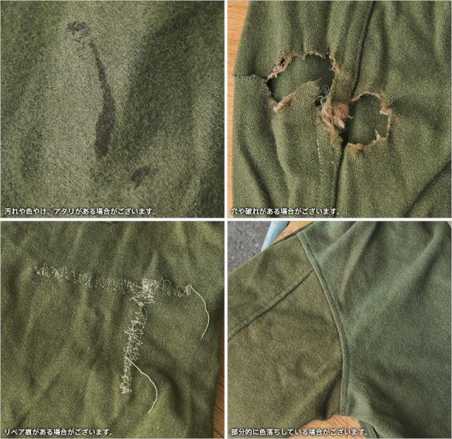 ※USED品の中から汚れや色やけ、アタリ、破れや穴、リペア痕、部分的な色落ちなどがある商品を選別しております。製品一つ一つ程度が異なりますが表情として捉えていただけるようでしたら、ミリタリーならではの味を十分に楽しめますのでぜひともお勧めしたいアイテムです。ファーストクオリティの品質を強くお求めの方は念の為ご購入をお控え願いますようお願い致します。
