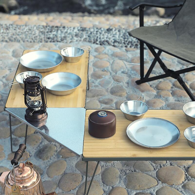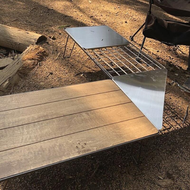 - 今まで荷物置きとして使っていたフィールドラックでしたが、焚火台をフィールドラックで囲み、この三角コーナーで繋いで、焚火テーブルとして使えて重宝しています。