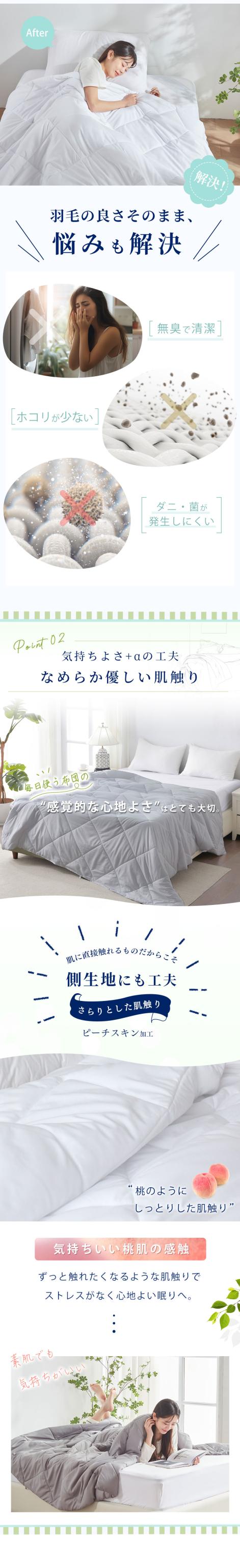 - 羽毛布団が苦手なため、こちらの商品を購入いたしました。 においも気になりません。 不具合があったため取り替えていただきましたが、お店の対応が素早く助かりました。 また必要時は購入させていただきます。