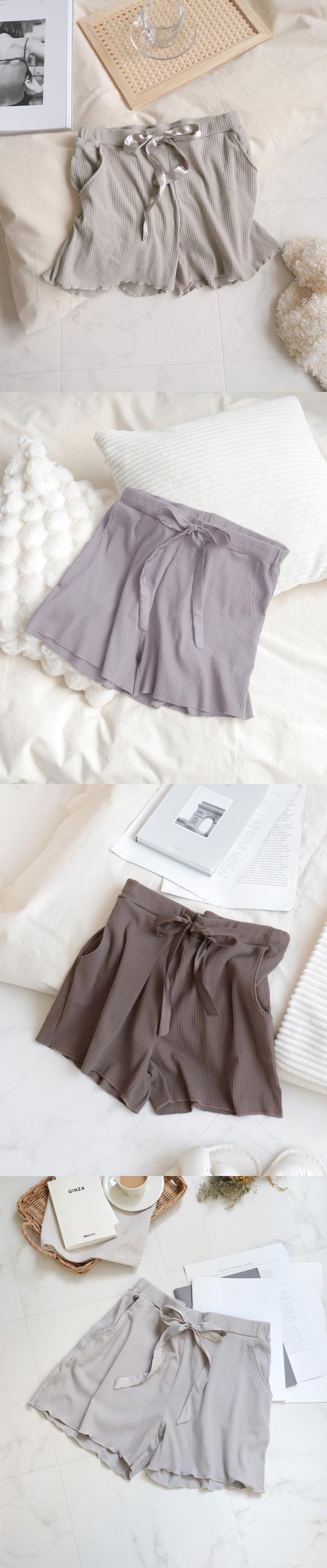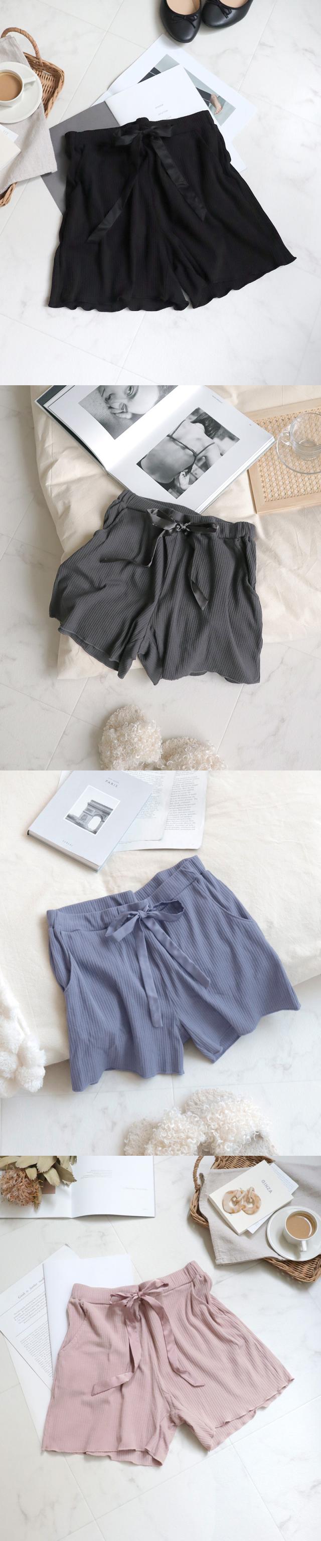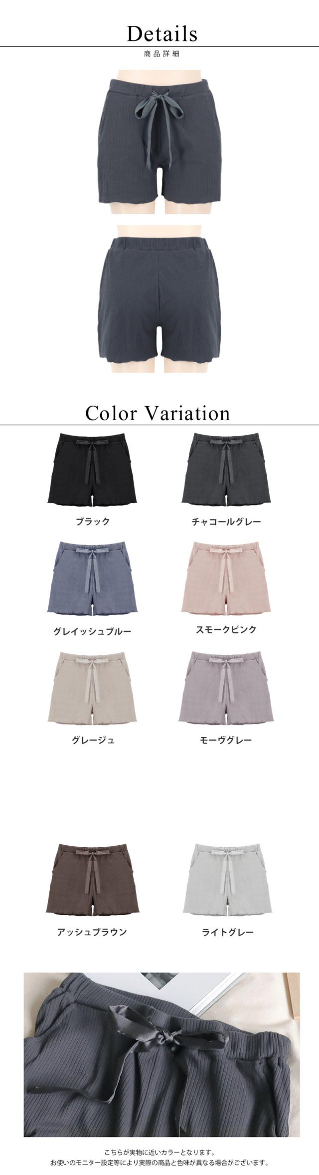| 柔らかなリブ生地を使用したショートパンツ。 裾メロウ&サテンリボンでフェミニンに仕上げました。 ウエストは楽に履ける調整可能な幅広ゴム仕様で、スマホが入るポケット付き。 |