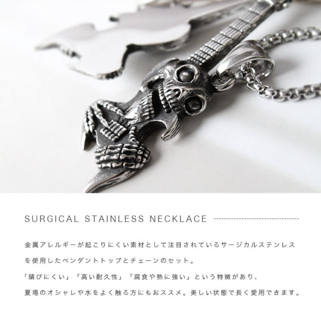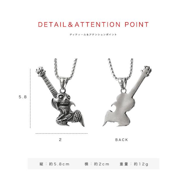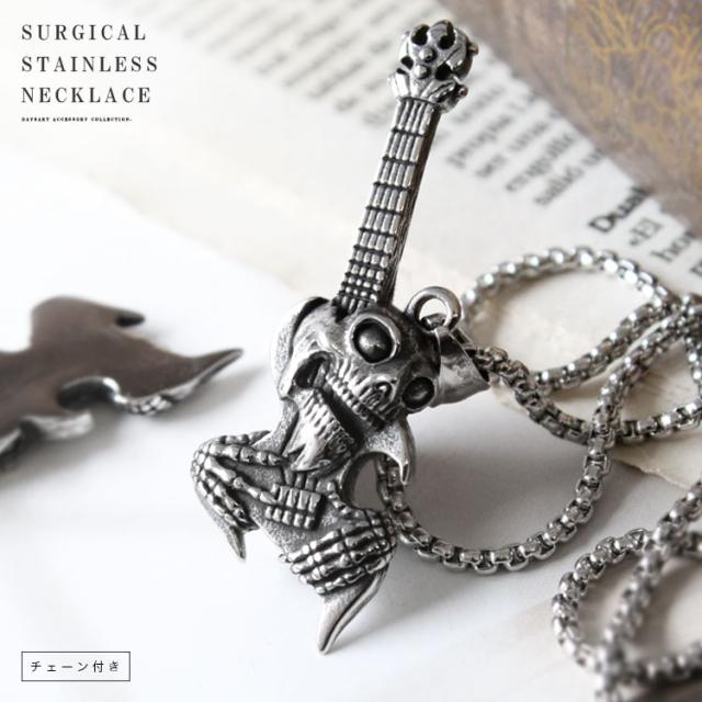 ステンレスペンダント ネックレス メンズ レディース 316Lサージカルステンレス ギター スカル ロック パンク チェーン付き シルバー【ギフト】ab-sn013