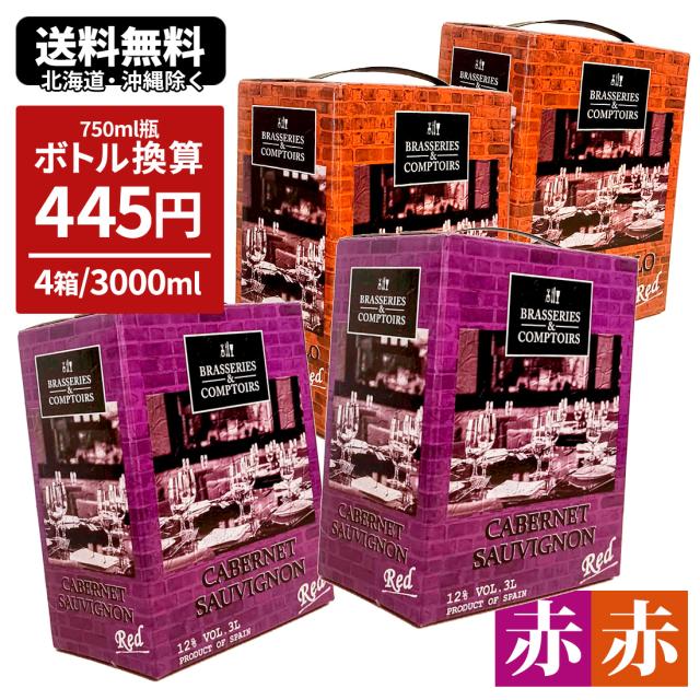 箱ワイン ワインセット 大容量 ブラッスリー・エ・コントワール カベルネ・ソーヴィニヨン&テンプラニーリョ 3000ml×赤4個 送料無料 一部除外 紙パック 【 送料無料 一部除外 ワイン スペイン ワイン ワインセット 3L bib 】