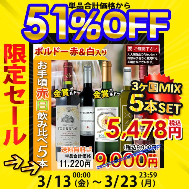 ボルドー赤&白や金賞スペイン産白ワインが入った、毎日楽しめるワインセット♪
