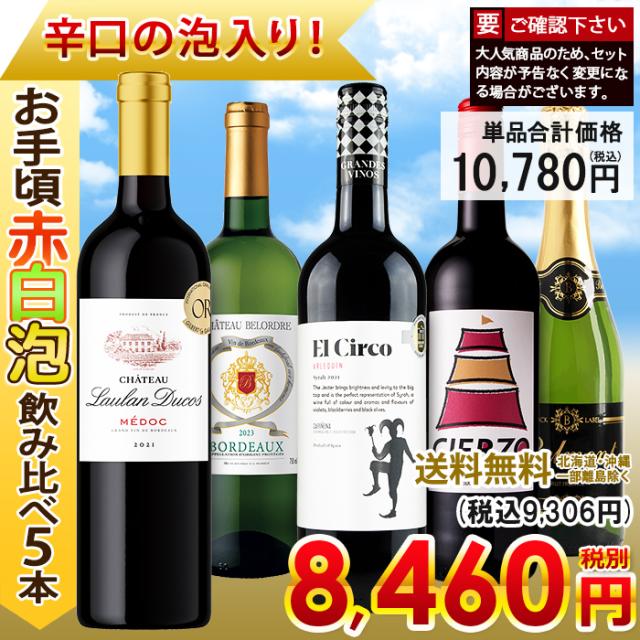 大銘醸地メドック金賞ワインや辛口スパークリングワインが楽しめる、飲み比べ5本セット。