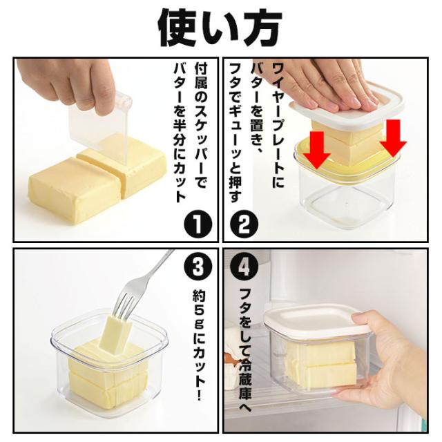 | 商品説明 | ・バターを切り分けそのまま保存できる「すぐ切れるバターカットケース」が登場。 ・ギュッとひと押しで簡単にカット。そのままケースごと冷蔵庫に保管できるから手を汚さない。 ・軽い力ですぐ切れるから常温に戻す手間必要なし! ・200gのバターでカットした場合、料理やお菓子作りに使いやすい約5gにカットしてくれる。(150gのバターは約3.7gにカット) ・バターが酸化しにくい、ピタっと密閉ケース♪ ・コンパクトに収納できるから冷蔵庫に収まりやすい◎ |