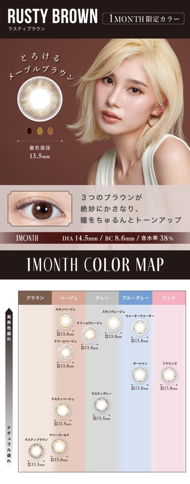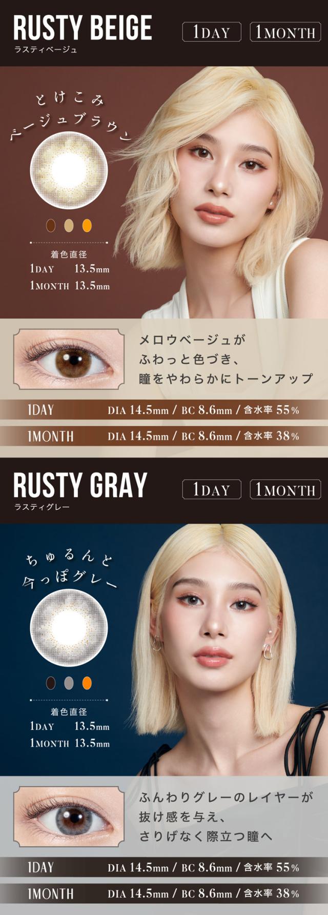 | クリームグレージュ | 度なし,-1.25,-1.50,-2.25,-2.50,-2.75,-3.00 -3.75,-5.00 -6.00,-6.50,-7.00,-7.50 |