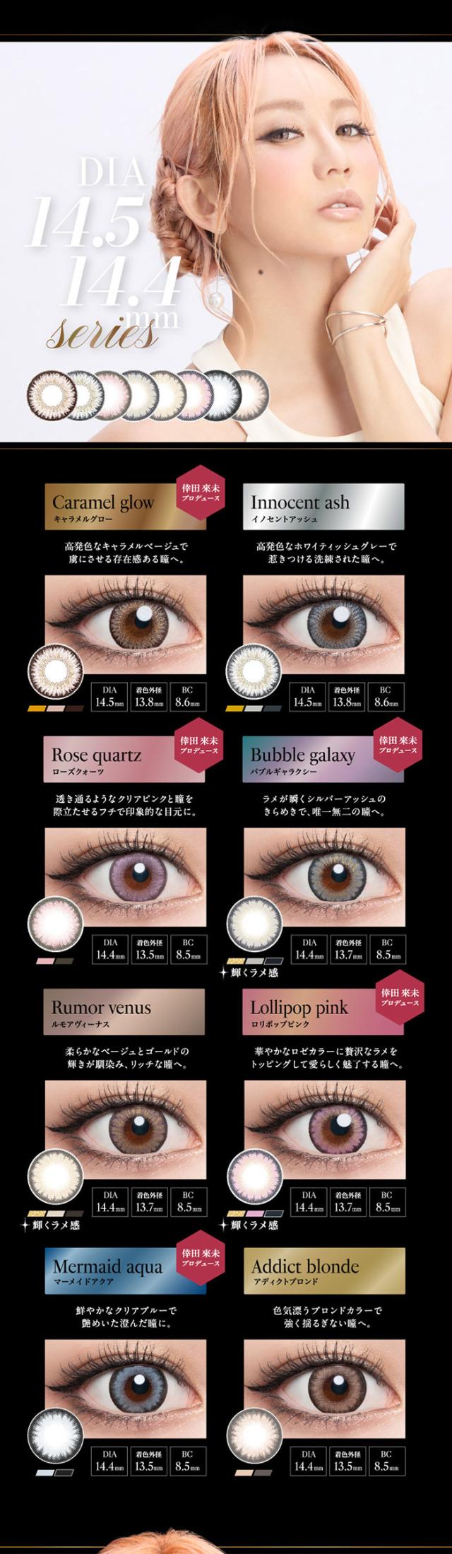 ロリポップピンク、マーメイドアクア、アディクトブロンド、ローズクォーツ、バブルギャラクシー、ルモアヴィーナス