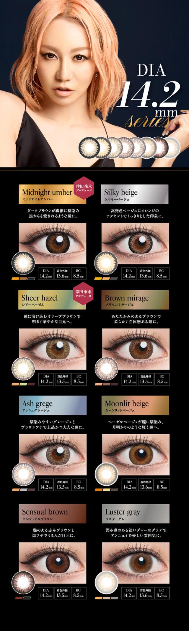 ミッドナイトアンバー、シルキーベージュ、シアーヘーゼル、ブラウンミラージュ、アッシュグレージュ、センシュアルブラウン、ムーリットベージュ、ラスターグレー