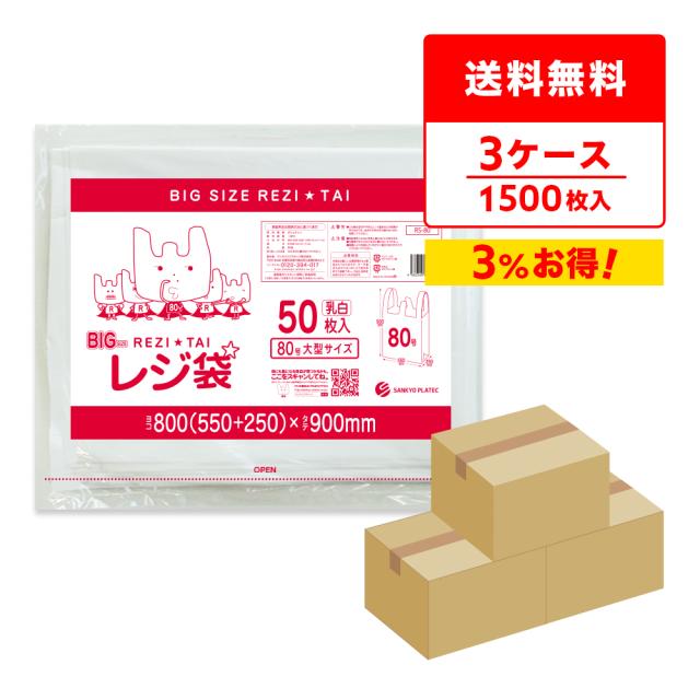 【まとめて3ケース】レジ袋 80号 西日本80号 乳白 厚手タイプ 0.025mm厚 50枚x10冊x3箱 RS-80-3 / 送料無料 大型レジ袋 ポリ袋 ビニール袋 手提げ袋 取っ手付きゴミ袋 買い物袋 持ち手付き サンキョウプラテック