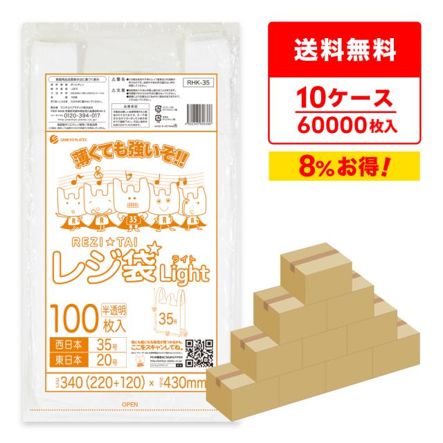 レジ袋 買い物袋 薄手 西日本 35号 (東日本20号) ブロック有 半透明 0.011mm厚 100枚x60冊x10箱 RHK-35-10/手提げ袋 持ち手付き袋 M ナチュラル 送料無料