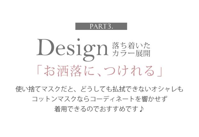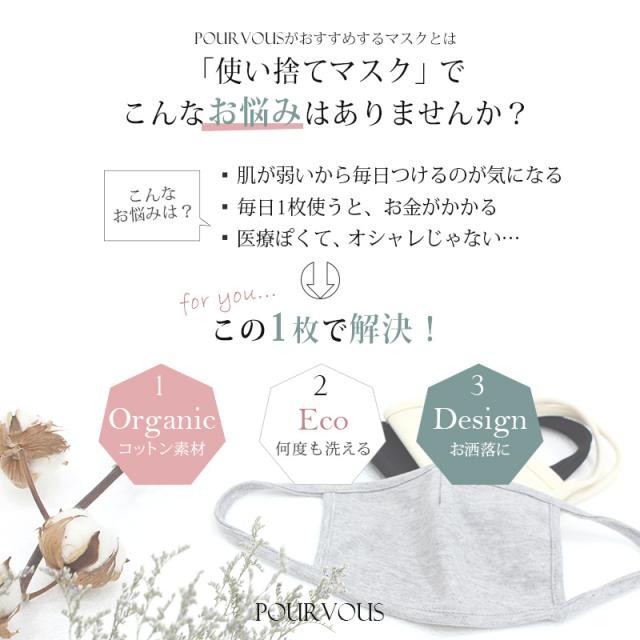 | ★繰り返し洗って使えて経済的! ------------------------------------------------------------ コットン素材を使ったマスクなので、家で洗って繰り返し使える家計にも嬉しいマスクです。 ★オーガニックコットン使用でやさしい肌触り ------------------------------------------------------------ 肌に直接当たる裏地は、オーガーニックコットン100%使用。 布製なので耳も痛くなりにくく、柔らか素材で肌にやさしい作りになっています。 ★服装に合わせて選べるカラー! ------------------------------------------------------------ コーディネートに合わせてマスクのカラーを選んでいただけます。 |