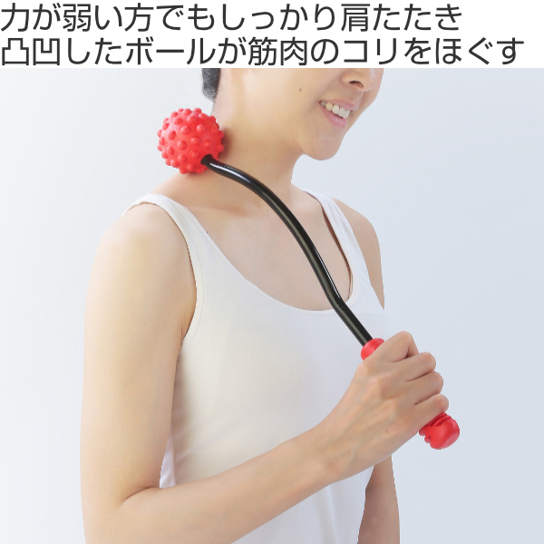 血行をよくしたり筋肉のコリをほぐしたり疲れをとるための肩たたきです。アームが鉄製なので、力が弱い方でもしっかり肩たたきできます。大きな凸凹ボールが肩にフィットします。背中、お尻、ふくらはぎなどにもご使用頂けます。握りやすいグリップで力も入りやすいです。