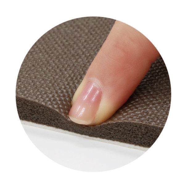 程よい厚みとクッション性のあるソフトな踏み心地で、長時間の立ち仕事による足への負担を軽減します。物が落下しても衝撃を吸収し、傷や凹みからフローリングを守ります。