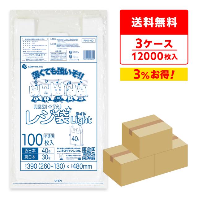 レジ袋 買い物袋 薄手 西日本 40号 (東日本30号) ブロック有 半透明 0.013mm厚 100枚x40冊x3箱 RHK-40-3/手提げ袋 持ち手付き袋 L ナチュラル 送料無料