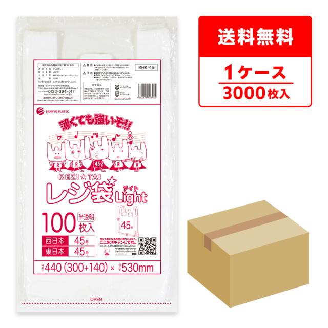 レジ袋 買い物袋 薄手 西日本 45号 (東日本45号) ブロック有 半透明 0.016mm厚 100枚x30冊 RHK-45/手提げ袋 持ち手付き袋 LL ナチュラル 送料無料