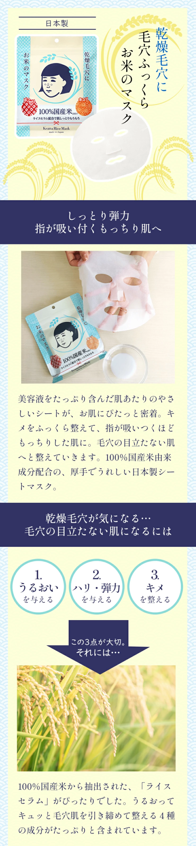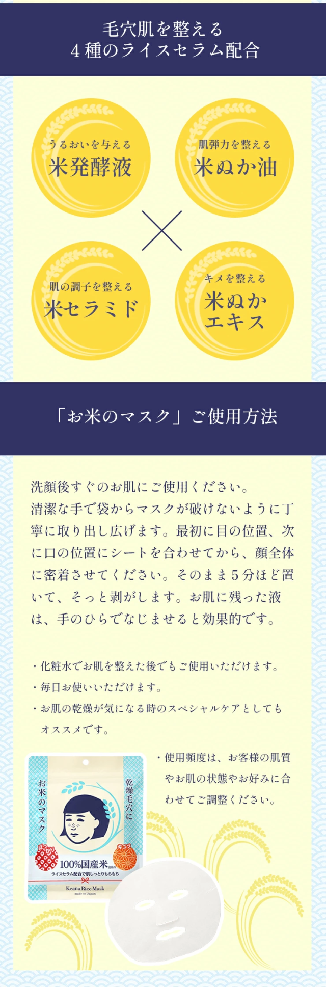 しっとりハリ・弾力のある肌に整えるシートマスク。「毛穴撫子 お米(※)のスキンケア」は、100%国産米由来のライスセラム配合の乾燥毛穴肌を整えるスキンケアです。 |