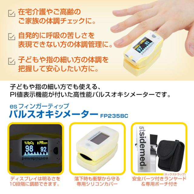 【医療機器認証】esフィンガーティップ パルスオキシメーター FP235BC PB ポーラーベア 専用シリコンカバー付 小児用 血中酸素濃度計 子供 大人 細い 在宅 看護 介護