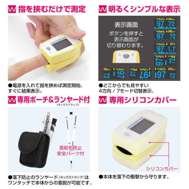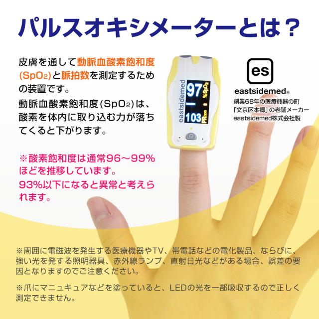 ■パルスオキシメーターとは?皮膚を通して動脈血酸素飽和度(SpO2)と脈拍数を測定するための装置です。動脈血酸素飽和度(SpO2)は、酸素を体内に取り込む力が落ちてくると下がります。酸素飽和度は通常、96〜99%ほどを推移しています。93%以下になると異常と考えられます。体調管理のひとつとしてご利用ください。