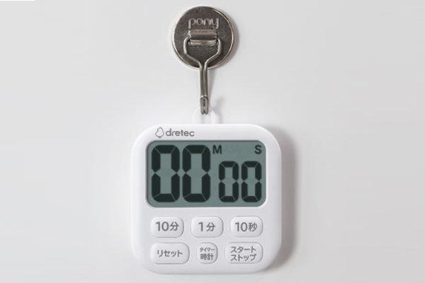 置いておきたい場所に合わせて設置方法が選べます。使わない時は冷蔵庫にマグネットで貼りつけたり、フックに引っ掛けて置けば、使いたい時にサッと手に取れて便利です。カウントアップ・カウントダウン機能付き。