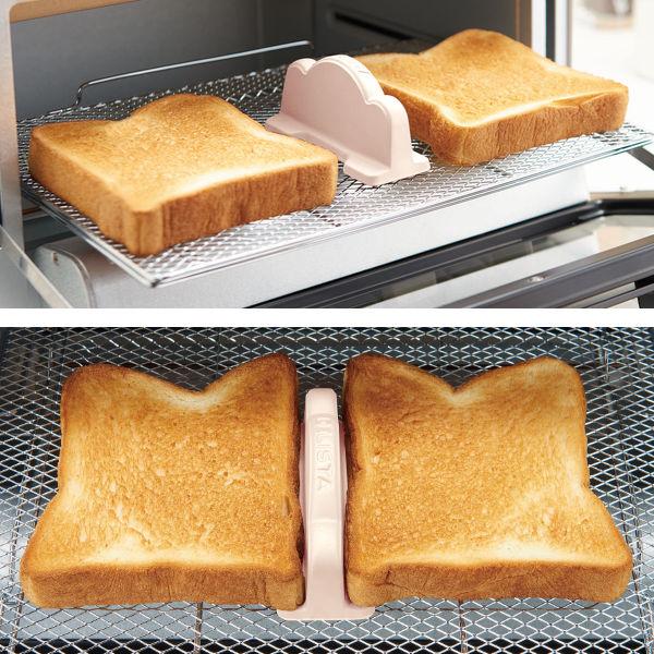 本品と食パン2枚を同時に焼けるコンパクトなサイズ感です。小さめトースターの場合は、脚部分にかぶせるように置くと、わずかな隙間だけで置けるようになります。