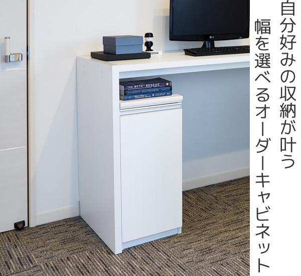 お部屋のスペースに合わせて、幅30cmから1cm単位でオーダーができるデスクキャビネットです。細かいサイズでオーダーができるので、お好みのサイズで空間を有効活用できます。