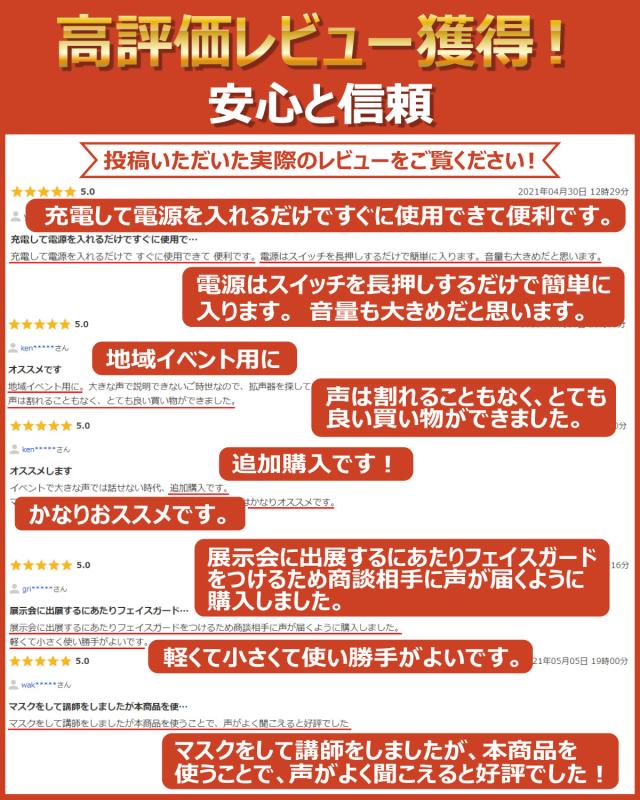 - 今まであまり使用頻度がなかったこともあり、どんな声のボリュームがでるかとても不安でしたが、思った以上に使い勝手が良く軽量さも魅力的で、思いきって購入してよかったです?おかげさまで、商品到着後翌日早々に使わせてもらいました???
