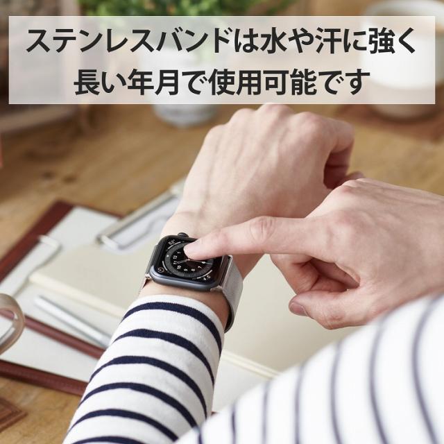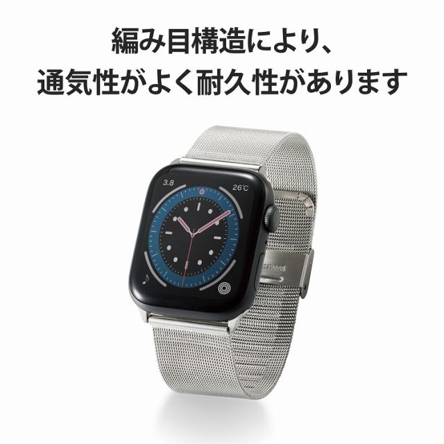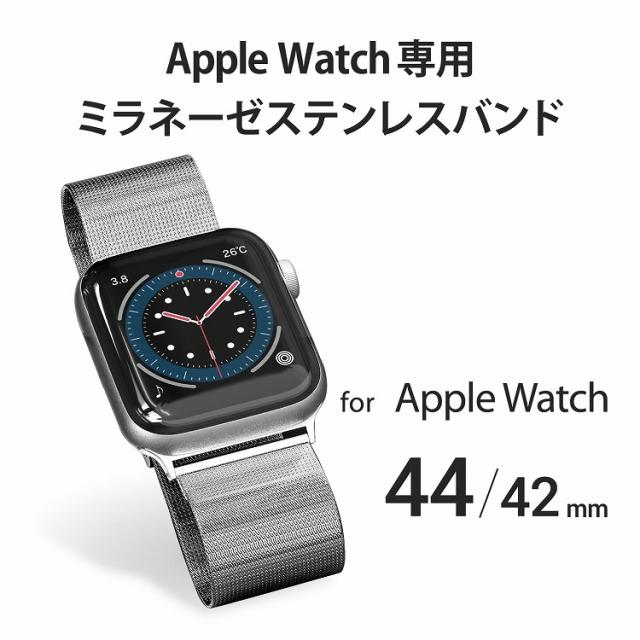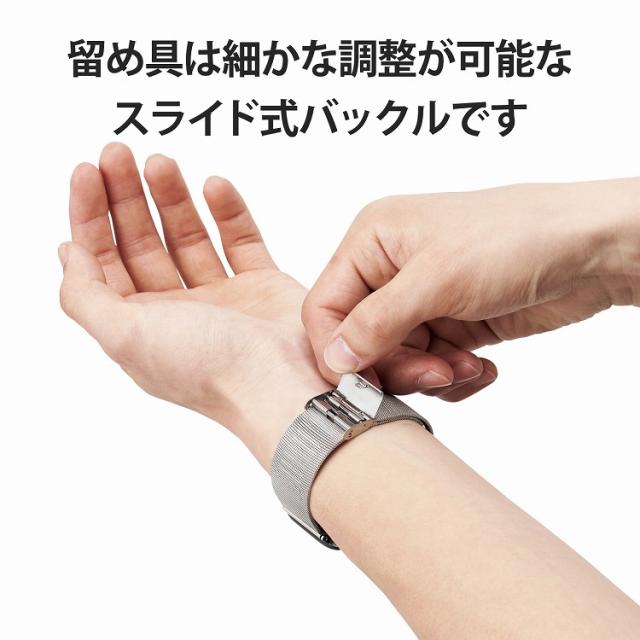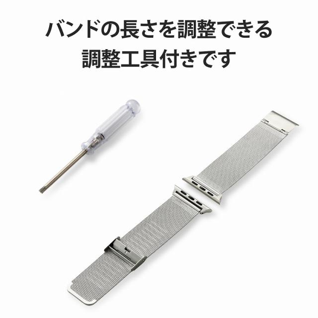 ■細かいサイズ調整ができ、編み込み構造により手首へのフィット感が高い、エレガントなデザインのApple Watch SE、Series 6、5、4 [44mm]、Apple Watch Series 3、2、1 [42mm]用ステンレスバンドです。[特徴]■細かいサイズ調整ができ、編み込み構造により手首へのフィット感が高い、エレガントなデザインのApple Watch SE、Series 6、5、4 [44mm]、Apple Watch Series 3、2、1 [42mm]用ステンレスバンドです。 ■ステンレス素材のスポーティ感と編み目構造のエレガントさで使いやすくファッション性の高いバンドです。 ■ステンレスバンドは水や汗に強く長い年月で使用することができます。 ■細長いステンレスを編み込んだ構造で、通気性がよく耐久性があり、細かな編み目がエレガントなデザインのバンドです。 ■Apple Watch本体カラーとマッチする、シルバーです。 ■Apple Watchとバンドを接続するラグ部分は外側からネジが見えず外れにくいオリジナル形状です。 ■留め具は、手首にフィットした細かな調整ができるスライド式バックルです。※1※2 ■バンドをApple Watchに装着したままで液晶画面の確認、本体の操作、各種ボタン操作、純正の磁気充電ケーブルへの設置が可能です。 ■バンドの長さを調整するための調整工具付きです。 ■※1 ミラネーゼバンドの着脱時にはApple Watchとバンドに重みがあるので落下にご注意ください。 ■※2 スライド式バックルの長さ調整時にはバンド側の溝と金具の溝が合った状態で留まるようにしてください。溝が合ってない状態で無理に留めると破損する恐れがあります。≪商品の概要≫■対応機種:Apple Watch SE、Series 6、5、4 [44mm]、Apple Watch Series 3、2、1 [42mm] ■セット内容:バンド×1、調整工具×1 ■材質:バンド本体:ステンレススチール ■カラー:シルバー ■バンドサイズ:125〜205mm ※装着可能な手首のサイズ