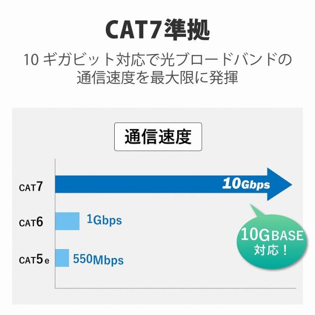 ■プロテクタと新素材コネクタ採用のダブル構造で、通常の使用環境では絶対にツメが折れない!※10GBASE-Tに対応し、取り回しがしやすいやわらかタイプのLANケーブル。※1000回の屈曲検査に合格(当社検証)[特徴]■ツメ折れ防止プロテクタと屈曲に対する耐久性が高い新素材コネクタを採用したダブル構造で、通常の使用環境では絶対にツメが折れないLANケーブルです。※1000回の屈曲検査に合格(当社検証) ■ツメ折れによるケーブルの脱落が防げ、長期にわたってしっかりとLANポートに固定することができます。 ■10GBASE-Tに対応し、高速で安定したネットワーク環境を実現します。 ■ケーブルが柔らかく取り回しがしやすい、スッキリと配線できる“やわらかLANケーブル”です。 ■エラー(エイリアンクロストーク)を防ぐ二重シールド構造を採用しています。 ■従来のケーブルより遮蔽効果に優れており、EMI(電磁妨害)対策が必要とされる医療施設、機械室・OAルームでの敷設にも最適です。 ■サビなどに強く信号劣化を抑える金メッキシールドプラグを採用しています。 ■ケーブルの外皮には、「JIS C 3005」に相当した、火災の延焼原因になりにくい難燃性素材を使用しています。 ■ISO/IEC 11801 ClassFに準拠しています。※ClassF(Cat7)準拠はケーブル部分のみです。本製品のプラグはRJ-45を採用しています。 ■EUの「RoHS指令(電気・電子機器に対する特定有害物質の使用制限)」に準拠(10物質)した、環境にやさしい製品です。≪商品の概要≫■カラー:ブルーメタリック ■インターフェイス:RJ-45コネクター ■環境配慮事項:EU RoHS指令準拠(10物質) ■規格:CAT7準拠(10BASE-T/100BASE-TX/1000BASE-T/1000BASE-TX/10GBASE-T)※CAT7準拠はケーブル部のみ。コネクタはRJ45仕様。 ■伝送速度:10Gbps ■伝送帯域:600MHz ■ケーブル長:2m ■ケーブル太さ:5.8mm ■芯数:8芯 ■結線方式:ストレート結線 ■ヨリ対芯線(ツイストペアケーブル):○ ■シールド:○(ScTP/2重フォイルテープシールド) ■外部シース(被膜)材質:PVC ■導体構成:ヨリ線(28AWG) ■コネクタ有無:両端コネクター付 ■モールド加工コネクタ:○ ■スリムコネクタ:○ ■爪折れ防止カバー付コネクタ:○ ■パッケージ形態:箱+インナートレー ■爪の折れないコネクタ:○
