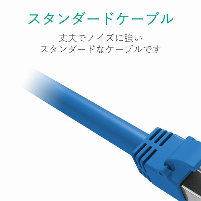 ■カテゴリー6の2倍以上である600MHzまでの高周波帯域まで対応しており、ノイズ干渉にも強く、高速で安定したネットワーク環境を実現します。 ■ギガビット以上の高速通信で起こりがちな、隣り合ったケーブル間でのノイズ干渉による通信エラー(エイリアンクロストーク)を防ぐ二重シールド構造を採用しています。 ■サビなどに強く信号劣化を抑える金メッキシールドプラグを採用しています。 ■ISO/IEC 11801 ClassFに準拠しています。※ClassF(Cat7)準拠はケーブル部分のみです。本製品のプラグはRJ-45を採用しています。 ■カラー:ブルー ■環境配慮事項:EU RoHS指令準拠(10物質) ■伝送速度:10Gbps ■ケーブル長:2.0m ■芯数:8芯 ■ヨリ対芯線(ツイストペアケーブル):○ ■外部シース(被膜)材質:PVC ■コネクタ有無:両端コネクター付 ■スリムコネクタ:○ ■パッケージ形態:アルミ箔袋+ステッカー ■PoE:○