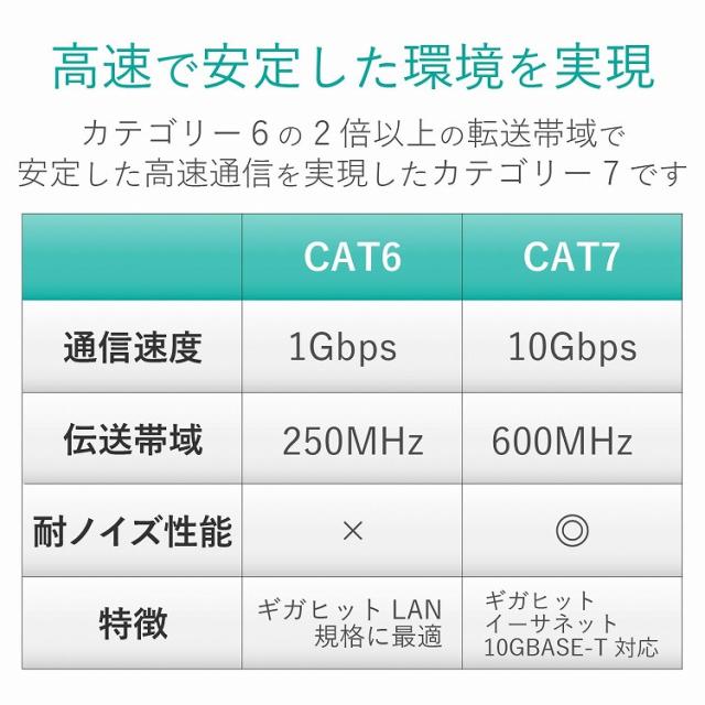 ■ツメ折れ防止プロテクタと屈曲に対する耐久性が高い新素材コネクタを採用したダブル構造で、通常の使用環境では絶対にツメが折れないLANケーブルです。※1000回の屈曲検査に合格(当社検証) ■ツメ折れによるケーブルの脱落が防げ、長期にわたってしっかりとLANポートに固定することができます。 ■10G BASE-Tに対応し、高速で安定したネットワーク環境を実現します。 ■カーペットの下やドアの隙間に配線できる薄さ約2.3mm、幅約7mmのフラットタイプです。 ■十字介在をなくしたツイストペア(ヨリ対線)仕様なので、柔らかく取り回しが簡単で、狭い場所での敷設も容易です。 ■サビなどに強く信号劣化を抑える金メッキシールドプラグを採用しています。 ■ケーブルの外皮には、「JIS C 3005」に相当した、火災の延焼原因になりにくい難燃性素材を使用しています。 ■ISO/IEC 11801 ClassFに準拠しています。※ClassF(Cat7)準拠はケーブル部分のみです。本製品のプラグはRJ-45を採用しています。 ■EUの「RoHS指令(電気・電子機器に対する特定有害物質の使用制限)」に準拠(10物質)した、環境にやさしい製品です。