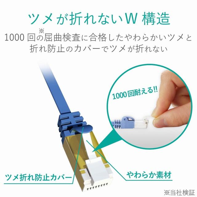 プロテクタと新素材コネクタ採用のダブル構造で、通常の使用環境では絶対にツメが折れない!※10G BASE-Tに対応し、薄さ約2.3mmで設置場所を選ばないフラットタイプのLANケーブル。※1000回の屈曲検査に合格(当社検証)