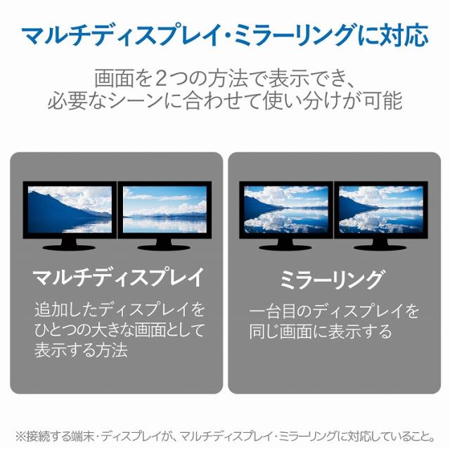 ■※ご使用の端末が映像出力に対応している必要があります。HDMIからUSB Type-Cへの変換はできません。 ■著作権保護技術のHDCP1.4に対応しています。 ■追加したディスプレイを一つの画面として表示するマルチディスプレイと、一台目のディスプレイと同じ画面を表示するミラーリングに対応しています。 ■外部ノイズの干渉を受けにくい3重シールドケーブルを採用しています。 ■対応機種:Type‐C端子搭載のPC及びHDMI端子搭載のモニター等 ■コネクタ形状:Type‐Cオス-HDMIメス ■対応解像度:最大4K×2K(30Hz) ■プラグメッキ仕様:金メッキ ■カラー:ブラック ■ケーブル長:0.15m