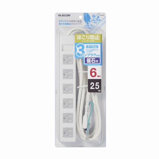 エレコム 延長コード 電源タップ 2.5m 3P 6個口 マグネット ホコリシャッター アース付キ EU 白 絶縁キャップ付 T-T1D-3625WH(代引不可)
