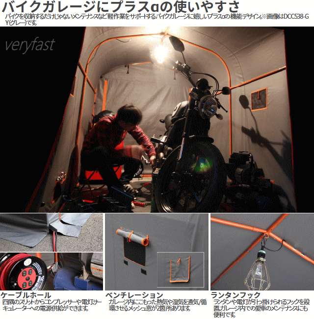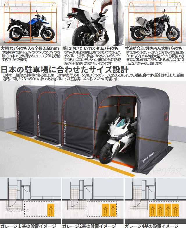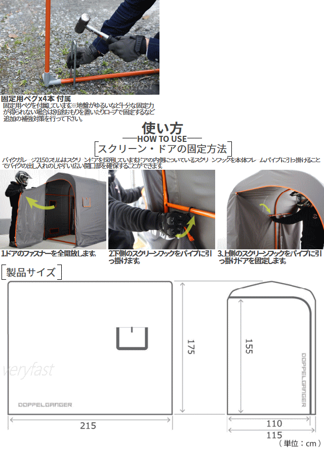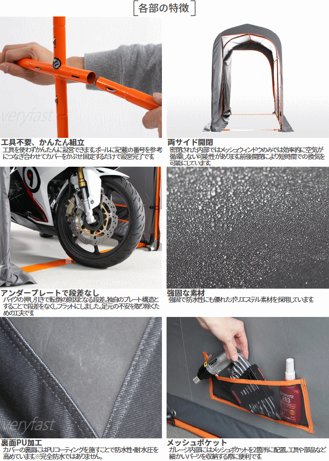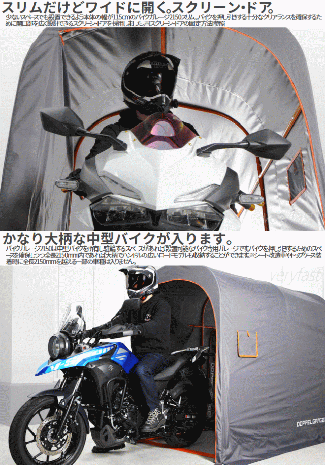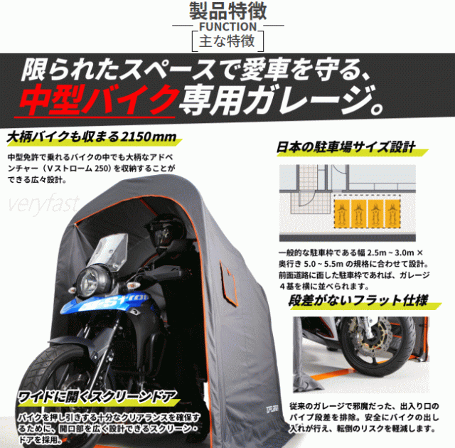 バイク乗りなら一度は憧れる愛車専用の空間。少ないスペースでも設置しやすいサイズに工夫を凝らした中型バイク用のガレージです。一般的な駐車枠の幅にも収まってバイクと愛を収納する。家を改築しなくても簡単に始められるガレージライフがあります。■カラー:グレー・オレンジ■サイズW115×L(D)215×H175cm■製品総重量(付属品含む)17.0kg■パイプ径20mm■組立て推奨人数2人以上■お客様組立目安時間60分■お客様に別途ご用意頂く必要がある工具:ゴムハンマー(組立て用)■原産国:中国※全長2150mmを越える一部の車種は入りません。トップケース装着時に全長2150mmを越える場合はケースを取外す必要があります。気密構造ではありません。雨風が侵入する場合があります。本製品は完全に雨を遮断するものではありません。カバーには防水コーティングを施しておりますが撥水を目的としたものではありません。台風等強風時は屋外で使用しないで下さい。カバーは雨・風の影響や太陽の紫外線により経年劣化します。【代引&同梱&配達日時指定不可・北海道&沖縄&離島(中継)地域送付不可】