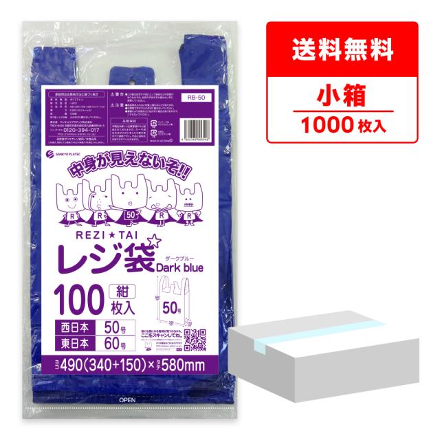 【小箱販売】レジ袋 西日本50号(東日本60号) 3Lサイズ 紺 ダークブルー 0.023mm厚 100枚x10冊 RB-50kobako / ポリ袋 ビニール袋 手提げ袋 取っ手付 買い物袋 持ち手付き袋 サンキョウプラテック 送料無料