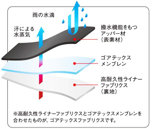 ゴアテックスフットウエアの機能性は、優れた防水性と透湿性を兼ね備えたゴアテックスファブリクス(ゴアテックスメンブレンに高機能の生地をラミネートしたもの)により足をドライな状態に保ちます。