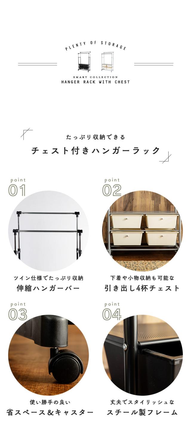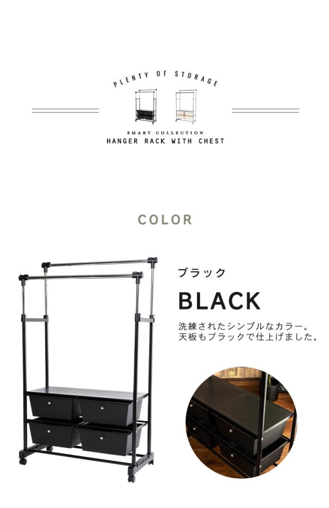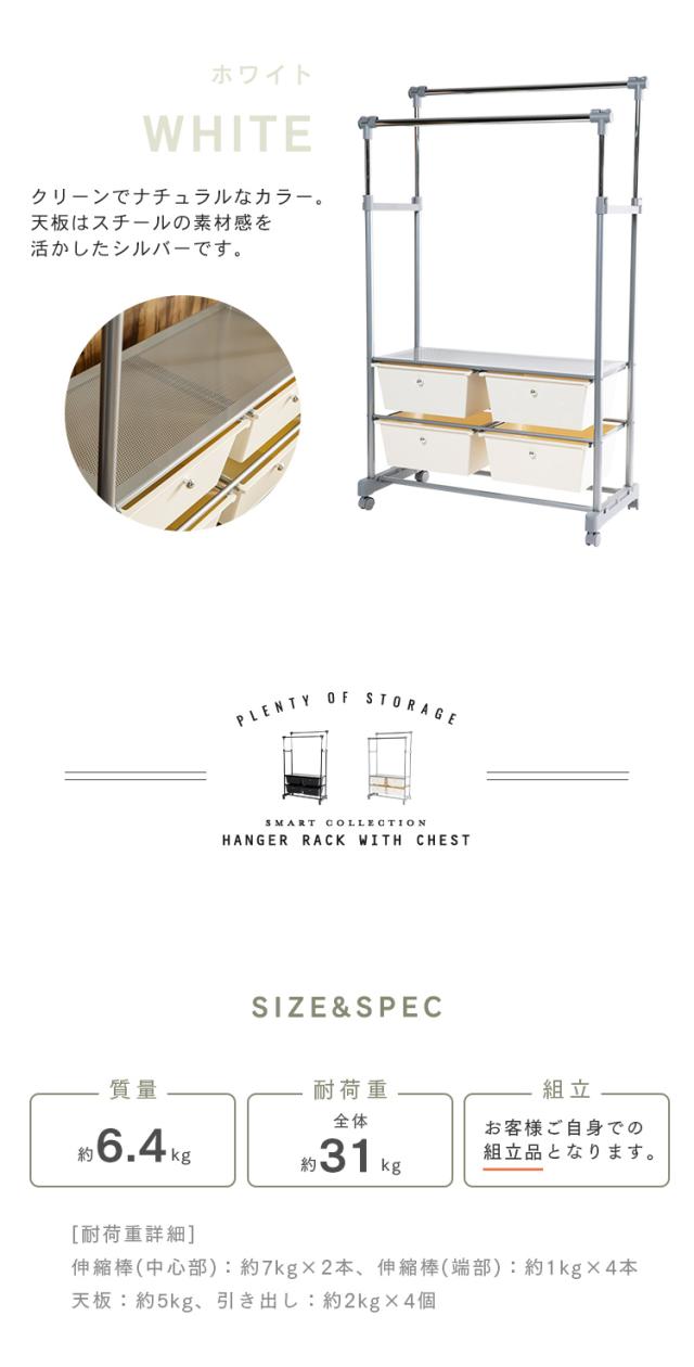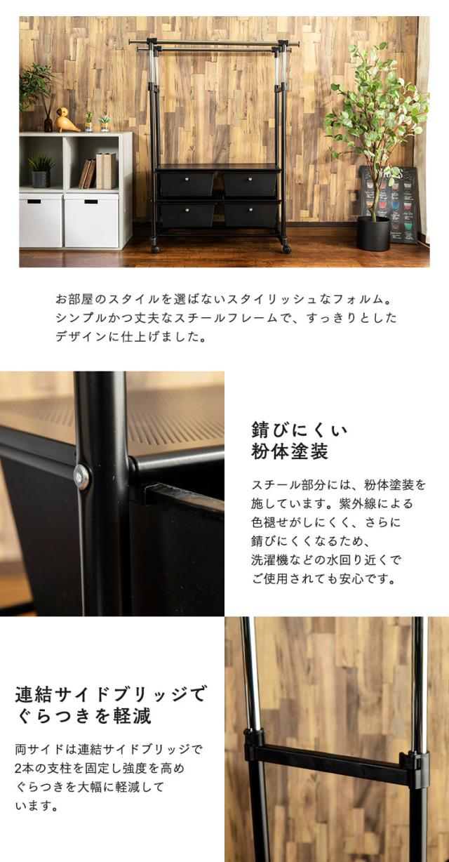 2本のハンガーバーと4つの引き出しで収納力たっぷり。
