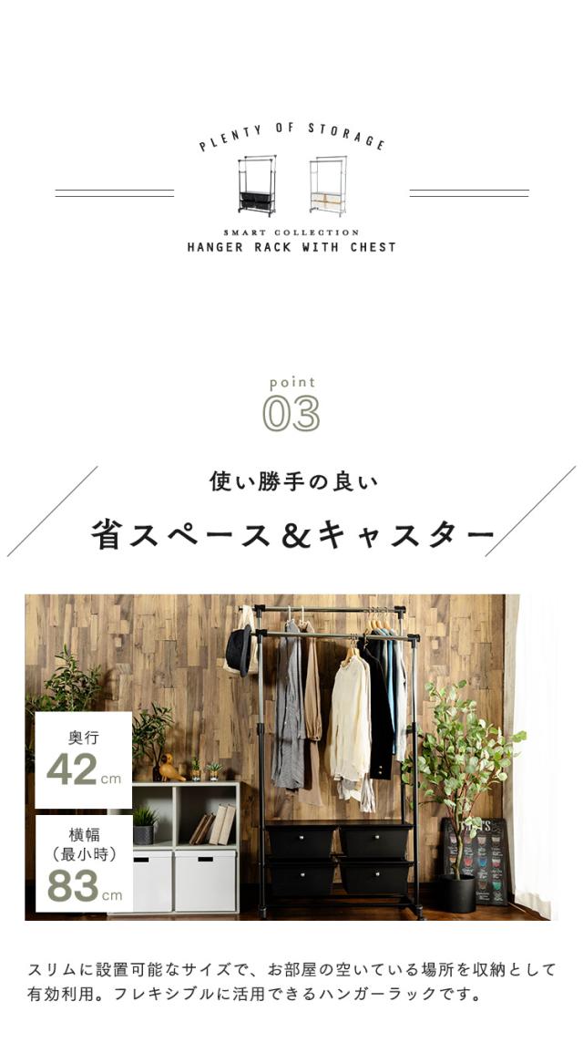 ★クーポンあり★ ハンガーラック キャスター付き チェスト付きハンガーラック CHLK-8342 ハンガーラック 衣類収納 スリム 引き出し付き 引き出し 省スペース ワードローブ 伸縮 高さ調整 キャスター 2段 幅83 ラック