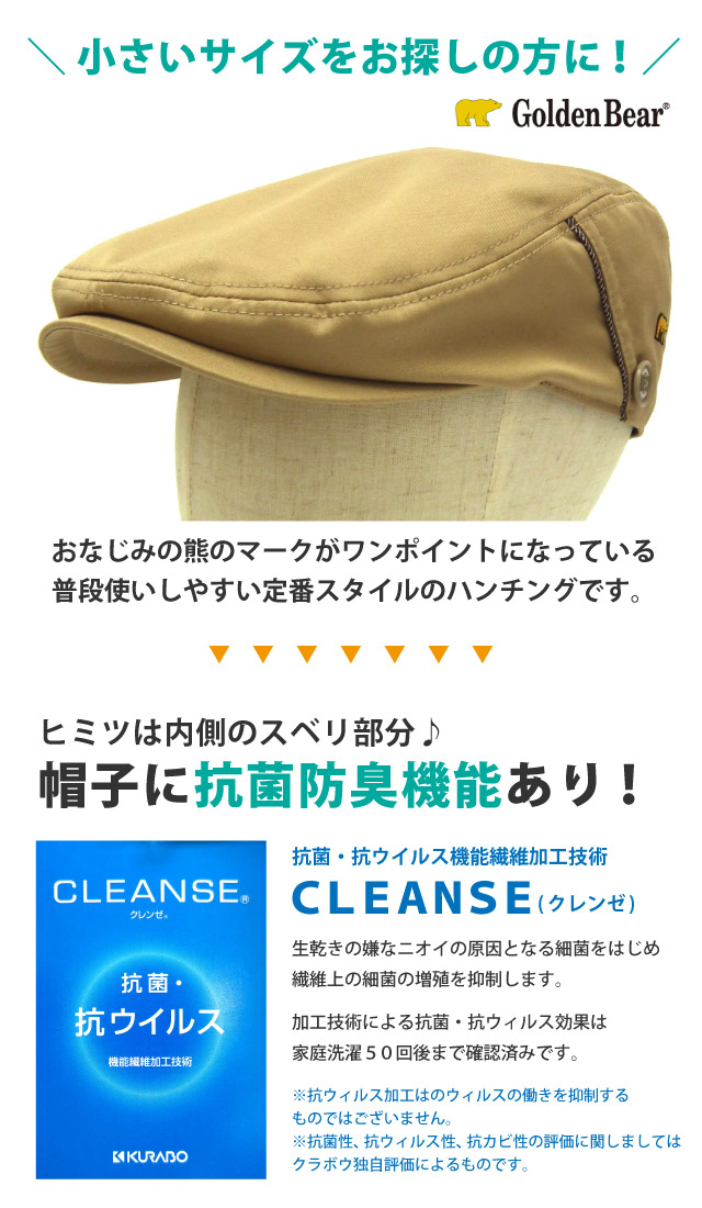 ハンチング Golden Bear 小さいサイズ マスクフック付帽子 メール便は送料無料 メンズ ゴルフ 洗える 抗菌 抗ウイルス加工 55cm-57cm 全3色 gb-111-127002 帽子 春夏 ゴールデンベアー 無地 耳が痛くない マスク補助具 無地 CLEANSE クレンゼ 加工