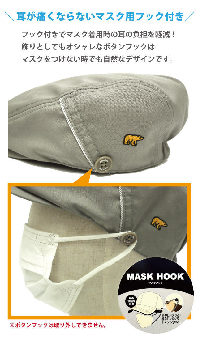 飾りボタンのようなフックは、マスクをつけない時もカジュアルで自然なデザインです。