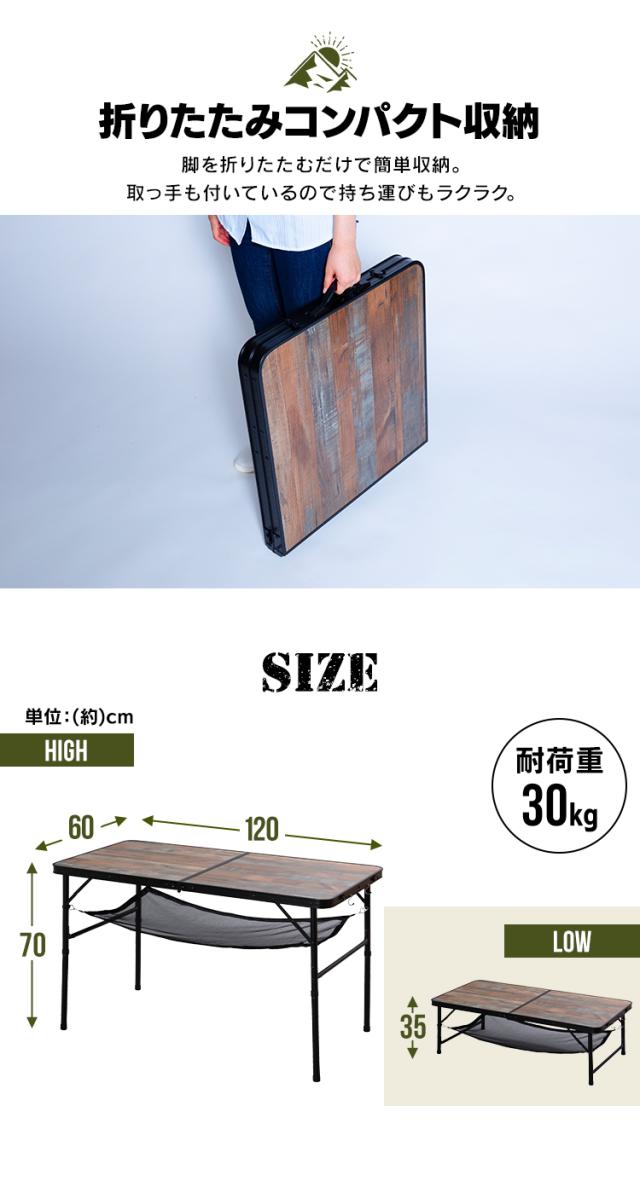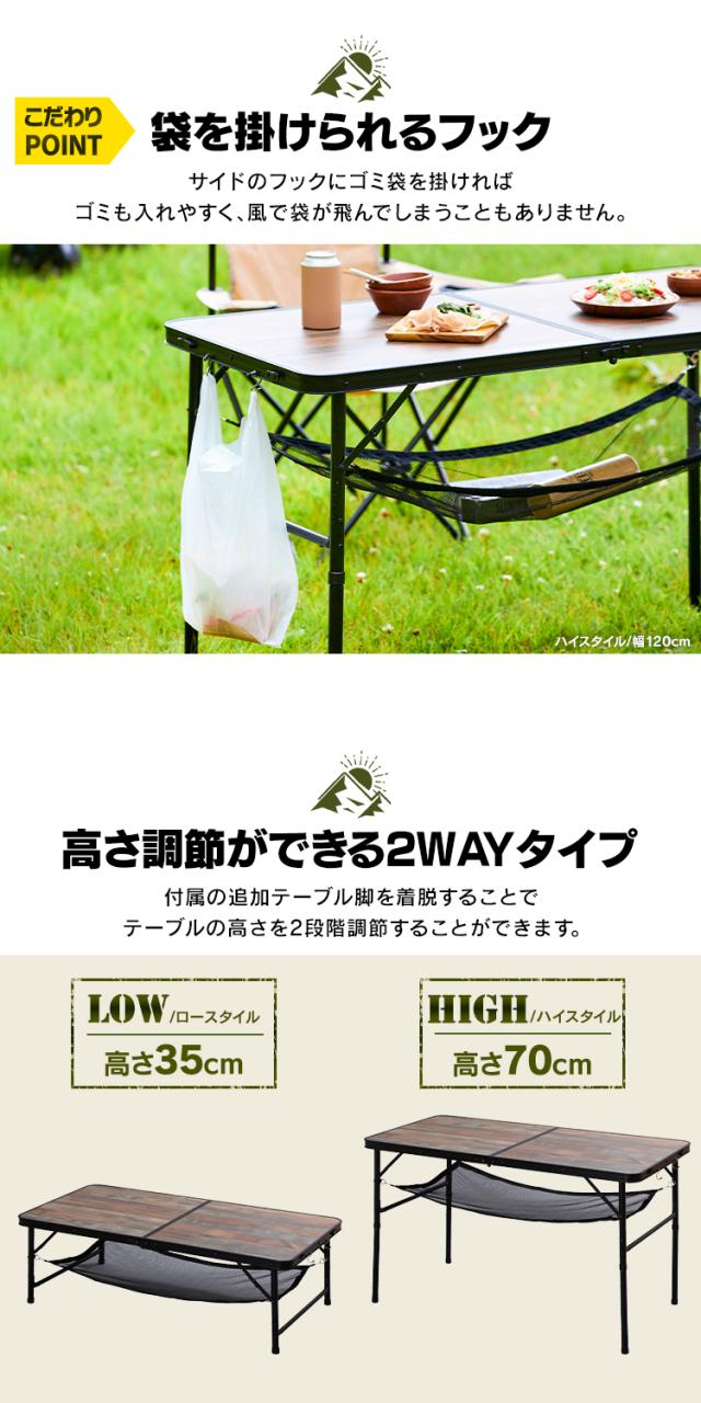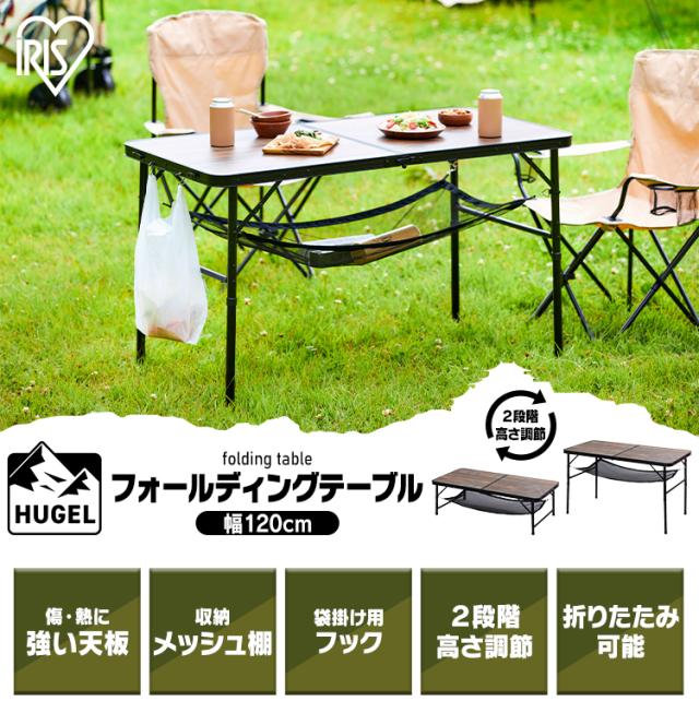 アウトドア 折りたたみテーブル 幅120cm アイリスオーヤマ * フォールディングテーブル FOT-1200 キャンプ用品 高さ ハイ ロー 2way キャンプ アウトドア レジャー メッシュ棚 木目 アンティーク調 HUGEL ヒューゲル 新生活