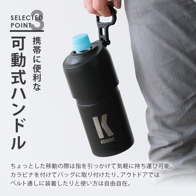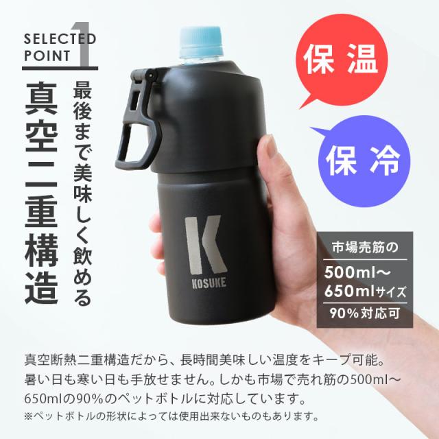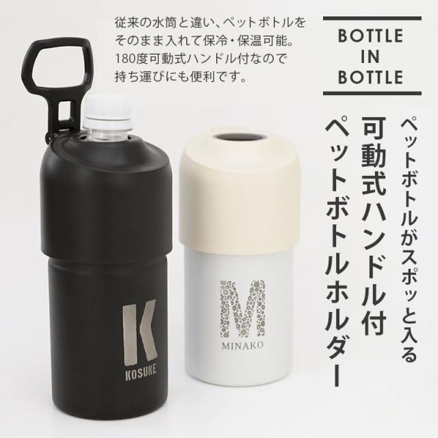ぬるくなると不味くなる炭酸飲料も、 このボトルインボトルがあれば美味しいまま! 1)ペットボトルがそのまま入るホルダー 暑い夏の日、外出先で購入したペットボトル飲料、 すぐにぬるくなってしまいますよね。 特に水筒に入れられない炭酸飲料は最後まで美味しく飲めない事も… こちらのボトルインボトルは移し替える手間なし! ペットボトルがそのまま入って保冷可能。 また、市場で売れ筋の500ml〜650mlの90%をカバー。 だから、自動販売機やコンビニで購入したペットボトル飲料を 快適温度をキープしたまま持ち運べちゃうんです♪ 水筒 には直接入れられない 炭酸飲料 乳酸菌飲料 清涼飲料水 。 またニオイがついてしまうから、と諦めていた飲み物 。 スポーツドリンク なども これさえあれば冷たいまま持ち運びOK! 車に置いておけば飲み終わったら買い換えて入れるだけ。 長時間のドライブでも快適です。 2)機能性 冷たいペットボトル飲料を入れてカバーをしっかりと締めるだけ。 たったこれだけで冷たい飲み物を長く美味しく持ち運べるんです! ・保冷 保温 効果 真空断熱二重構造だから、長時間冷たい温度をキープ! 暑い日でも安心です。 冬はもちろん あたたかい 飲み物もOK。 年中手放せない相棒になりそうです。 - 実際にスタッフが使用してみました - 朝入れた冷たいお茶のペットボトルが夕方まで冷たい状態! 約6時間程度は美味しく飲めました。 ※サイズ・ご使用環境により異なります。 ・結露なし 冷たいペットボトルをデスクに置いておくと結露して書類が濡れてしまう… こちらはそんな心配もありません。 朝冷蔵庫から取り出したペットボトルも ボトルインボトル なら 結露しない から、バッグの中に入れるのにも快適です。 スタイリッシュなデザインだから、オフィスなどの 職場 にもおすすめです。 ・折りたたみ式ハンドル付き ペットボトルをそのまま持ち運ぶと結露で手が濡れてしまったり、 手が塞がり、煩わしさを感じる事も。 こちらは携帯に便利な ハンドル付き。 ちょっとした移動の際は指を引っかけて気軽に持ち運び可能。 折りたたみ式 なので持ち運び時以外はすっきり収納できて、 鞄やリュックにしまう時も、スペースの邪魔になりません。 カラビナを付けてバッグに取り付けたり、 アウトドアシーンではベルト通しに装着したりと使い方は自由自在。 手荷物を持たない男性にもおすすめです。 ・お手入れ簡単 水筒の様に細かなパーツが無いから、ストレス無く洗えるのもポイント。 茶渋など衛生面が気になる水筒に比べ、清潔にお使いいただけます。 水筒を洗うのが面倒…そんな 男性 へのプレゼントにおすすめです。 3)無料!お名前彫刻 わざわざ名前を書く事の無いペットボトル。 アウトドアシーンなどでは 誰の物か分からなくなってしまう事もありますよね。 こちらはお名前彫刻で一目瞭然です♪ 名入れギフト専門店の当店で、無料で名入れ彫刻を施します。 当店自慢のレーザー加工による名入れサービスは、 職人の手でひとつひとつ丁寧に施しております。 ずっと消えない彫刻だから、贈り物として大変喜ばれます。 【 名入れギフト専門店のこだわり 】 「 どうして名前入りが喜ばれるの? 」 自分の名前が入った商品は世界にただ一つだけ。 “ 自分の事を考えながら選んでくれたんだ ” そう感じさせてくれます。 だから、相手を大切に想う気持ちがより伝わります。 さらにお名前彫刻はずっと消えずに残るから、 永く愛着を持って使っていただけます。 だから、「名入れギフト」は大切な人に感謝の気持ちを伝えるのにぴったりなおくりもの。 私たちは、贈られた人も贈った人もみんなが笑顔になれる商品をお届けします。 〔 こんなシーンにおすすめ 〕 ・ 炭酸ドリンク 果汁ドリンク を冷たく長時間持ち歩きたい方に ・ ステンレスボトルクーラー ボトルクーラー ボトルカバー として ・ ペットボトルカバー ペットボトルケース 保冷ペットボトルホルダー として |