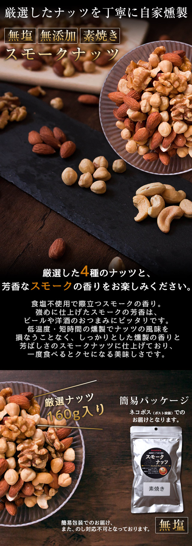 自家燻製 無塩スモークナッツ160g 送料無料 ネコポス(他商品との同梱不可)