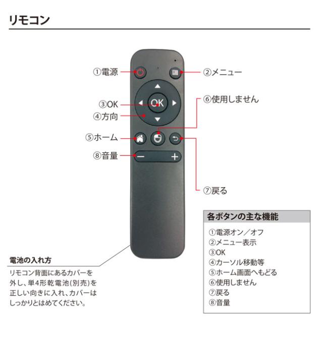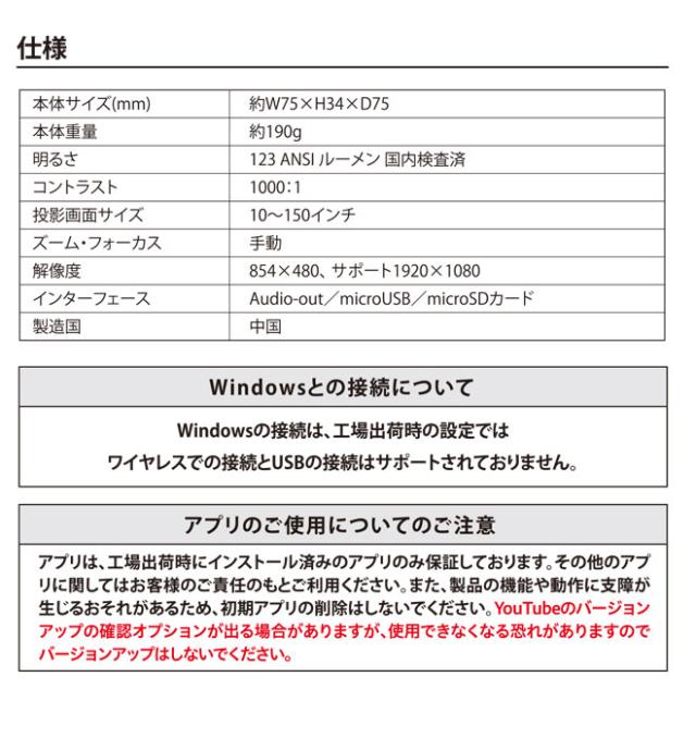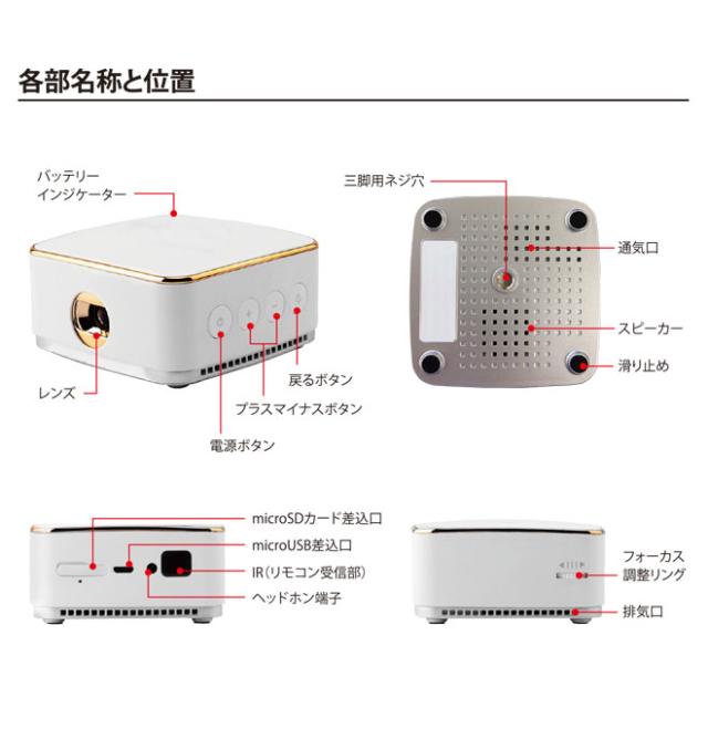 セット内容:プロジェクター本体、リモコン(単4形乾電池×2本/別売)、ミニ三脚(約110mm~220mm)、マイクロUSB/USB変換ケーブル(約0.2m)、マイクロUSB/USBケーブル(約1m)、USB電源アダプター、取扱説明書/保証書
