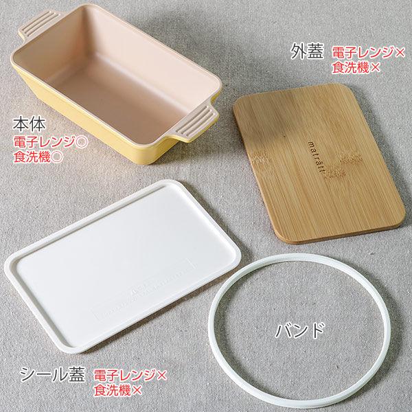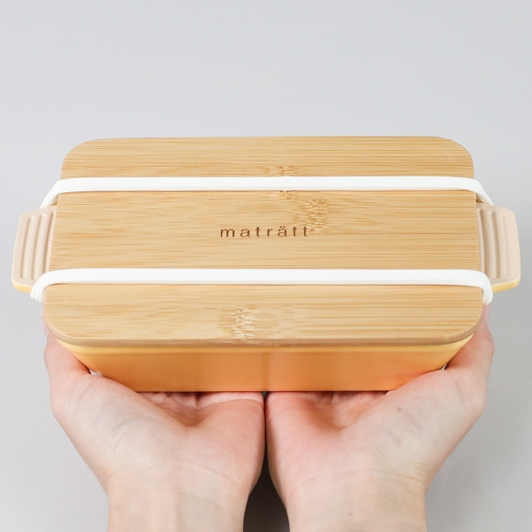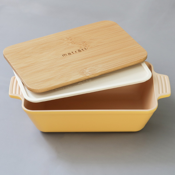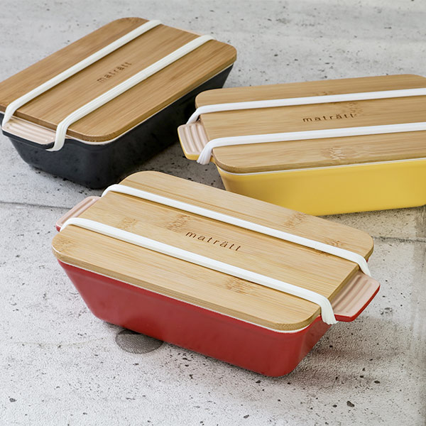 まるでグラタン皿のような形の本体とナチュラルな竹の蓋の北欧風ランチボックスです。抗菌加工が施されているので、直接食材を入れても安心してお使いいただけます。