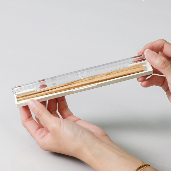 スリムなスクエア型のケースなので収納場所にも片づけやすいです。クリアのフタになっているのでお箸が入っているか一目瞭然で確認できます。時々入れ忘れることがるので助かります。